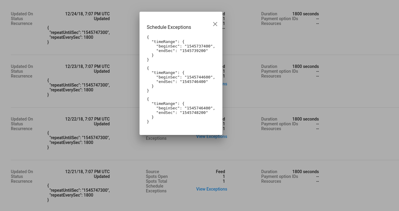 [[["易于理解","easyToUnderstand","thumb-up"],["解决了我的问题","solvedMyProblem","thumb-up"],["其他","otherUp","thumb-up"]],[["没有我需要的信息","missingTheInformationINeed","thumb-down"],["太复杂/步骤太多","tooComplicatedTooManySteps","thumb-down"],["内容需要更新","outOfDate","thumb-down"],["翻译问题","translationIssue","thumb-down"],["示例/代码问题","samplesCodeIssue","thumb-down"],["其他","otherDown","thumb-down"]],["最后更新时间 (UTC):2025-07-26。"],[],["The Availability Viewer tracks a slot's history for a merchant and service. Users must input the Merchant ID, Service ID, and slot Start time. Time ranges can be specified using the datetime picker with timezone selection. Results can be sorted by column, with Start time descending by default. Multiple entries can exist for a slot with different resources. Deleted slots show a red trash icon, and their history reflects deletions and updates. Recurrence and schedule exceptions are detailed via the \"View Exceptions\" link, and additional slot attributes are accessible through a separate link.\n"]]