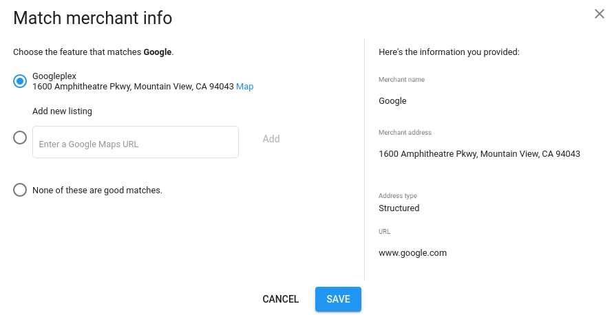 Damit Händler in „Mit Google reservieren“ besser zugeordnet werden können, hast du im Partner-Portal die Möglichkeit, eine URL für einen Brancheneintrag in Google Maps vorzuschlagen. Das Actions Center verwendet diese Informationen als Vorschlag, um einen neuen übereinstimmenden Kandidaten zu erstellen.