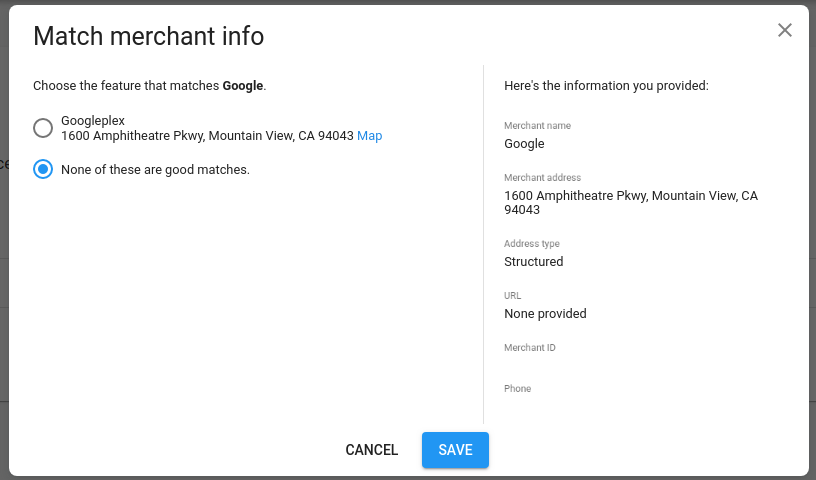 หากพบว่าระบบจับคู่ผู้ขายกับสถานที่ตั้งที่ไม่ถูกต้อง หรือไม่พบการจับคู่ผู้ขาย ให้คลิกปุ่มแก้ไขในคอลัมน์จับคู่แล้วใช่ไหมเพื่อแก้ไขผู้ขาย จากนั้นเลือกจากรายการตัวเลือกที่ตรงกันมากที่สุด และจับคู่ผู้ขายกับฟีเจอร์ที่ถูกต้อง เลือกตัวเลือกที่ตรงกัน จากนั้นคลิกบันทึกที่ด้านล่างของโมดอลเพื่อใช้การเปลี่ยนแปลง