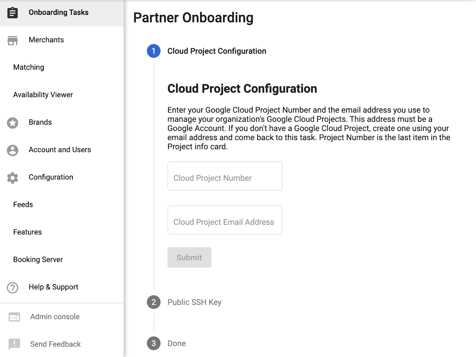 - Na stronie Zadania wstępne w Portalu Partnera wykonaj krok 1, przesyłając numer projektu w chmurze i adres e-mail tego projektu (adres e-mail używany do administrowania projektem w chmurze).