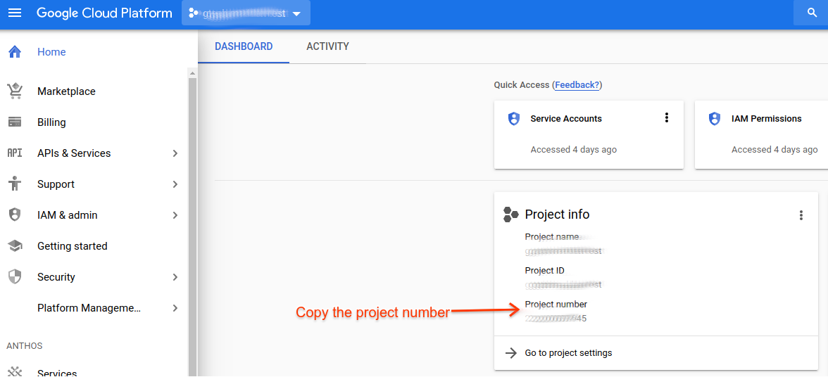 الصفحة الرئيسية لخدمة Google Cloud Platform. يكون رقم المشروع على السحابة الإلكترونية رقميًا