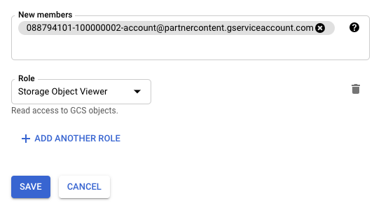 088794101-100000002-account@partnercontent.gserviceaccount.comEn el menú desplegable, selecciona Visualizador de objetos de almacenamiento y haz clic en Guardar.