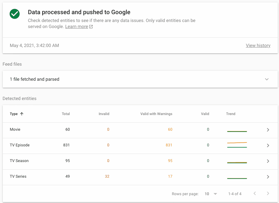 ตอนนี้คุณใช้ Google Search Console เพื่อตรวจสอบสถานะและเนื้อหาของฟีดการดำเนินการที่มีสิทธิ์ได้แล้ว หากฟีดมีสิทธิ์ ตัวแทนของ Google จะสร้างพร็อพเพอร์ตี้แคตตาล็อกซึ่งแสดงถึงฟีด พร็อพเพอร์ตี้นี้แสดงประวัติการนำเข้าฟีดทั้งหมดในช่วง 90 วันที่ผ่านมา พร้อมข้อมูลข้อผิดพลาดโดยละเอียดตามประเภทเอนทิตี ดูข้อมูลเพิ่มเติมได้ที่ส่วนรายงานฟีดและการค้นหาเอนทิตีในศูนย์ช่วยเหลือของ Search Console