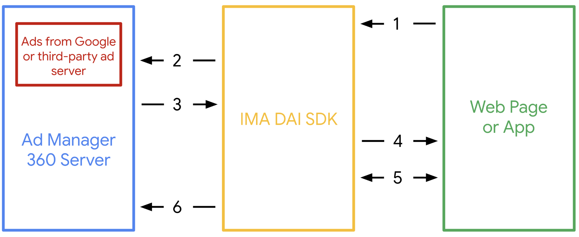 - Le SDK demande un flux de vidéo à la demande ou un flux en direct à partir de Google Ad Manager 360.