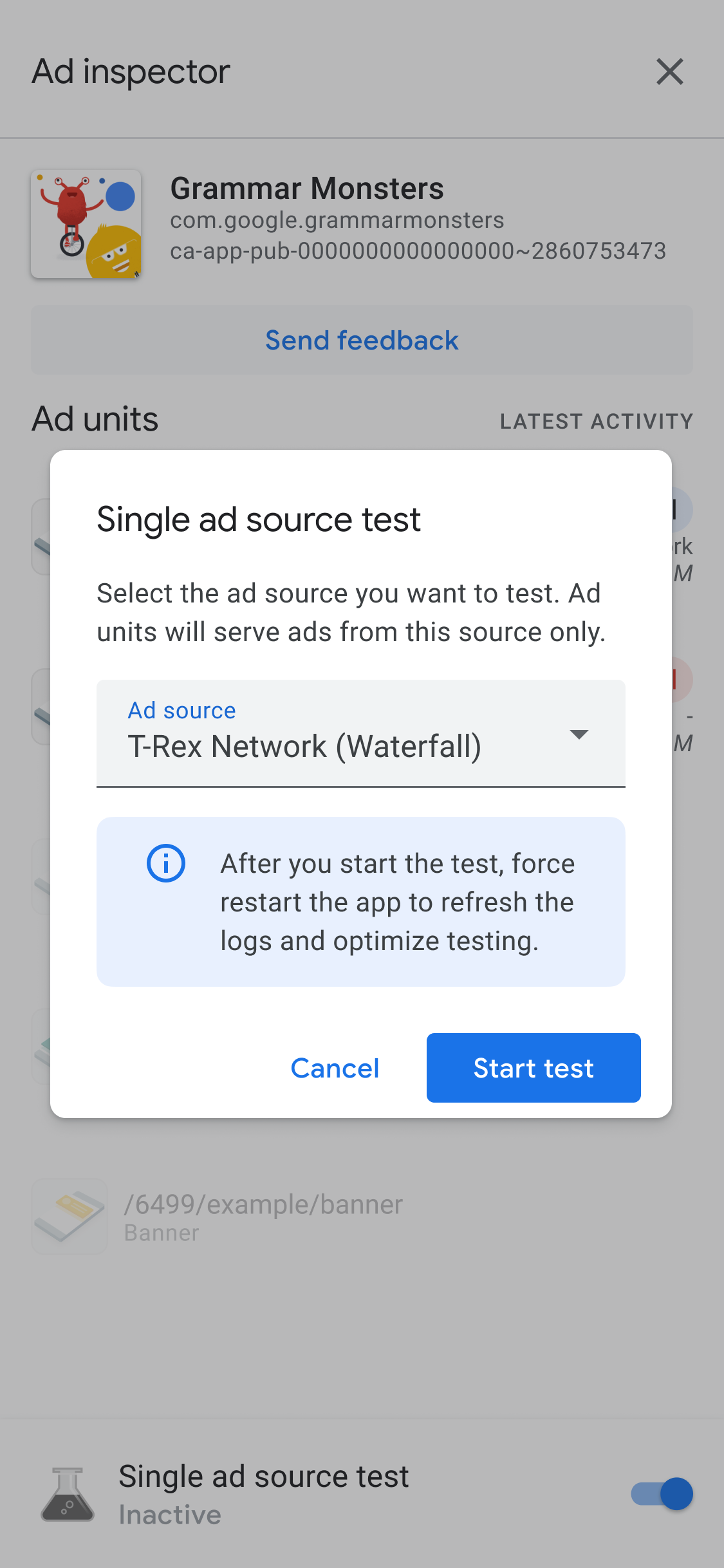 Wybierz źródło reklam do przetestowania. Następnie wyświetli się strona Wymuś ponowne uruchomienie aplikacji: