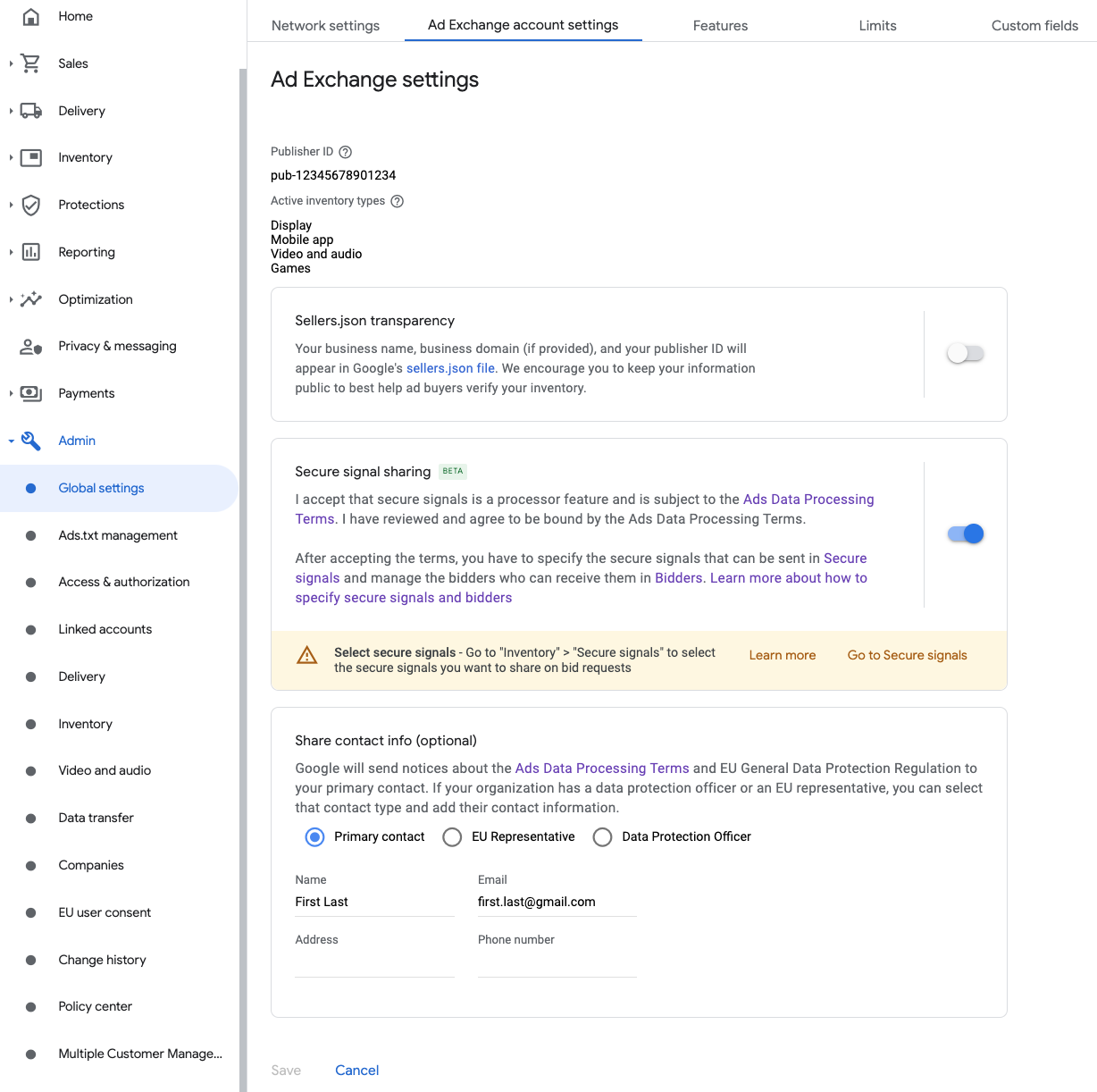 Acesse Administrador > Configurações globais. Acesse a guia Configurações da conta do Ad Exchange e ative a opção Compartilhamento de indicador seguro. Clique em Salvar.