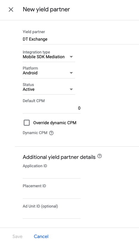 Insira o ID do aplicativo e o ID da posição obtidos na seção anterior, além do valor do CPM padrão. Clique em Salvar.