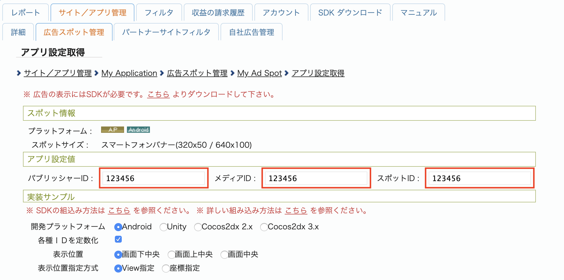 請務必為 Ad Manager 註冊測試裝置。i-mobile 提供測試用的 Spot ID、媒體 ID 和發布商 ID,您可以在這裡找到這些 ID。