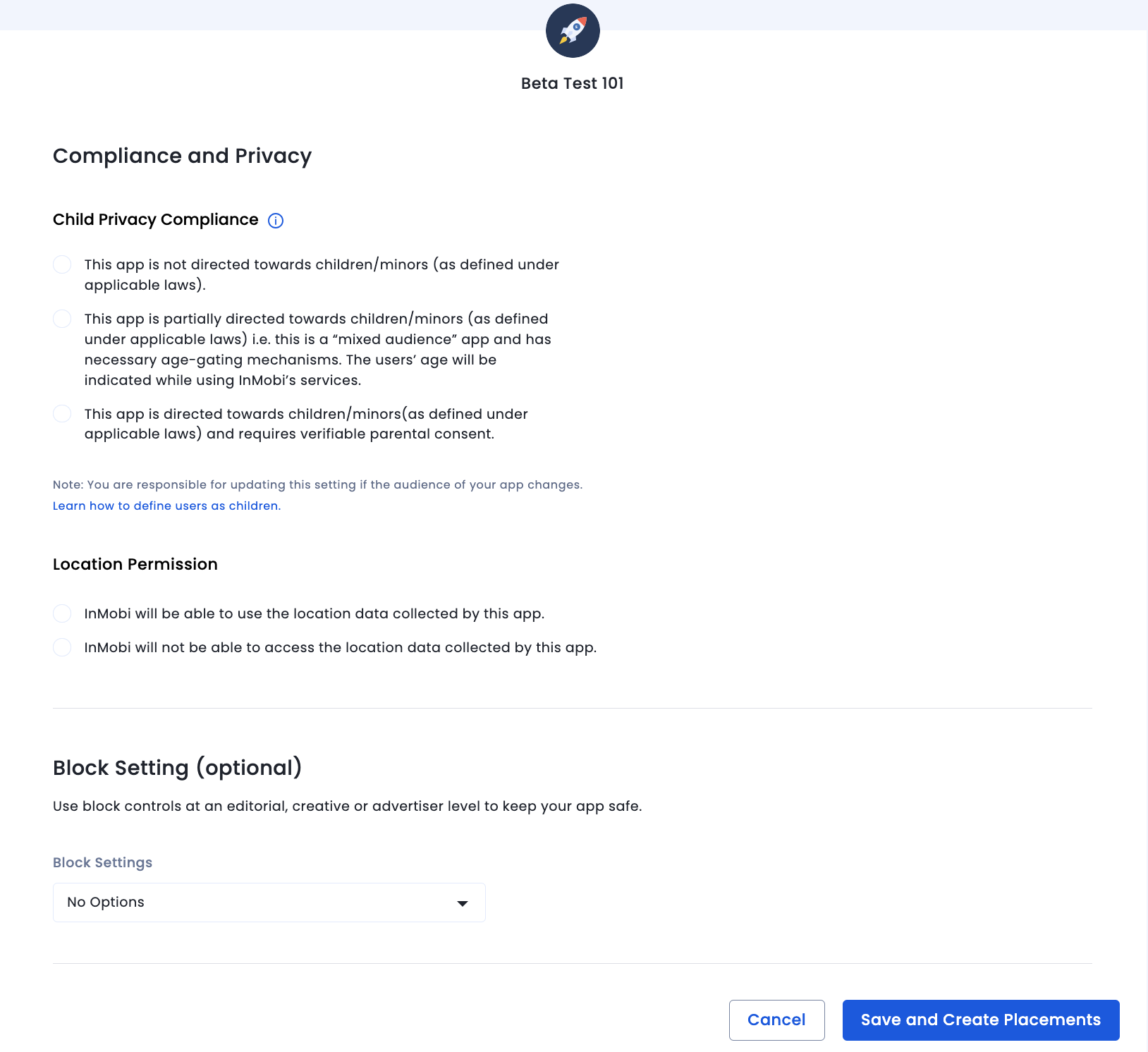 檢查「應用程式和網站法規遵循」設定,然後按一下「儲存並建立刊登位置」。
