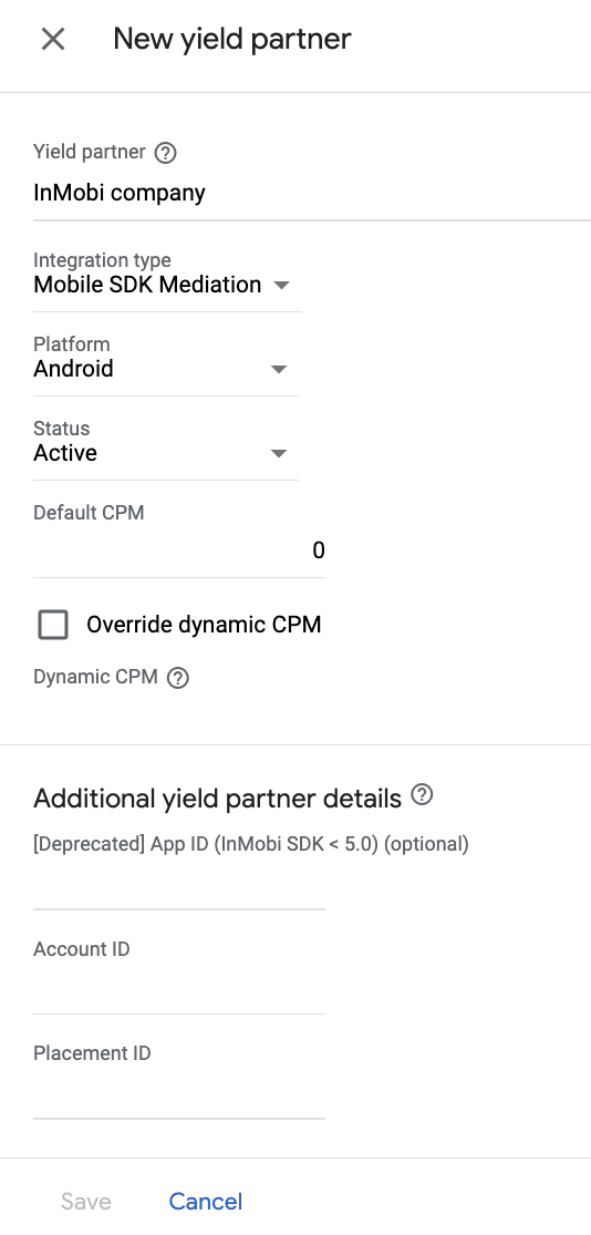 選取您先前為 InMobi 建立的公司。將「整合類型」設為「Mobile SDK 中介服務」、「平台」設為「Android」,並將「狀態」設為「有效」。