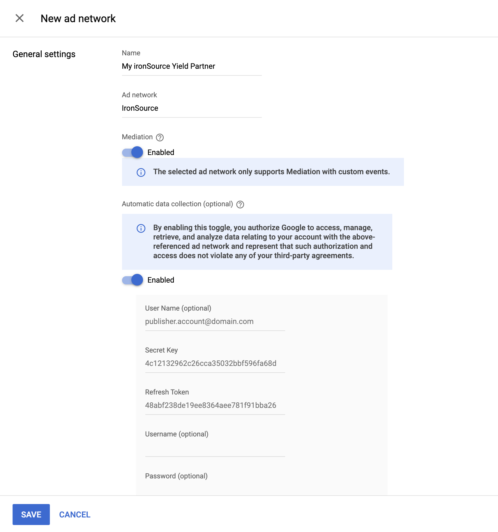 Выберите ironSource Ads в качестве рекламной сети , введите уникальное имя и включите медиацию .
