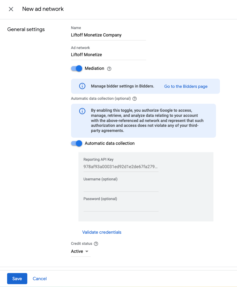 Выберите Liftoff Monetize в качестве рекламной сети , введите уникальное имя и включите медиацию . Включите автоматический сбор данных и введите ключ API для отчетов, полученный в предыдущем разделе.