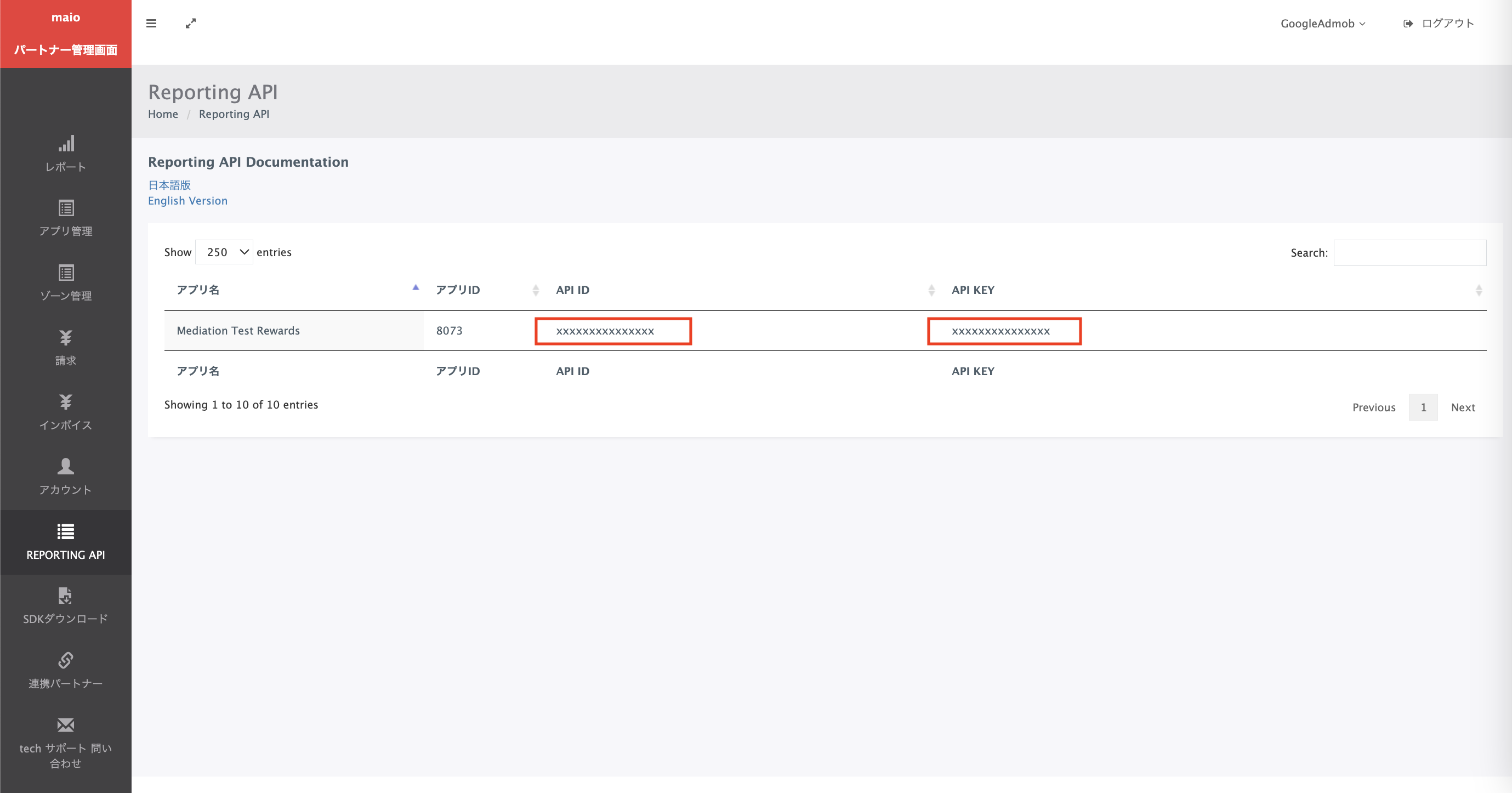 بالإضافة إلى معرّف الوسائط ومعرّف المنطقة، ستحتاج إلى معرّف واجهة برمجة التطبيقات ومفتاح واجهة برمجة التطبيقات لإعداد رقم تعريف الوحدة الإعلانية للتوسّط. في صفحة Reporting API، دوِّن معرّف واجهة برمجة التطبيقات ومفتاح واجهة برمجة التطبيقات.