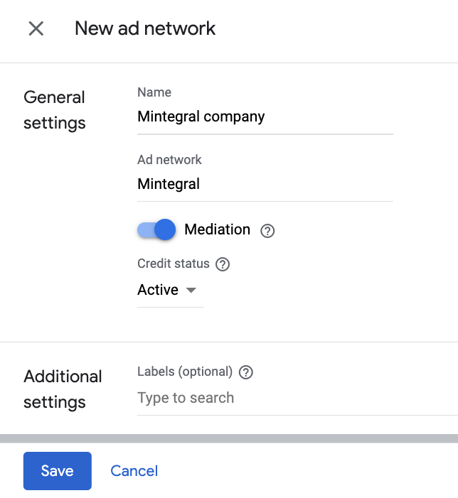 Selecione Mintegral como a Rede de publicidade, insira um Nome exclusivo e ative a Mediação.