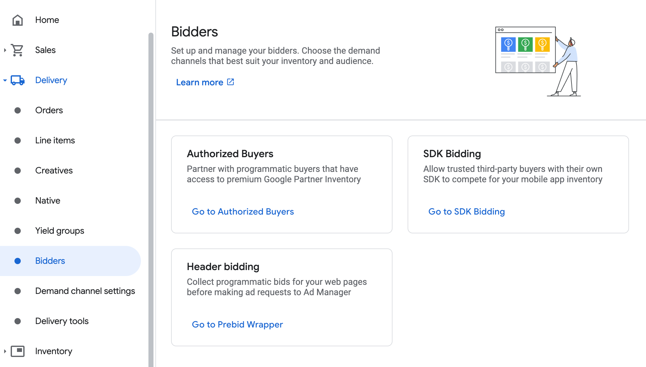 Chuyển đến mục Phân phối > Bên đặt giá thầu, rồi nhấp vào Chuyển đến tính năng Đặt giá thầu qua SDK.