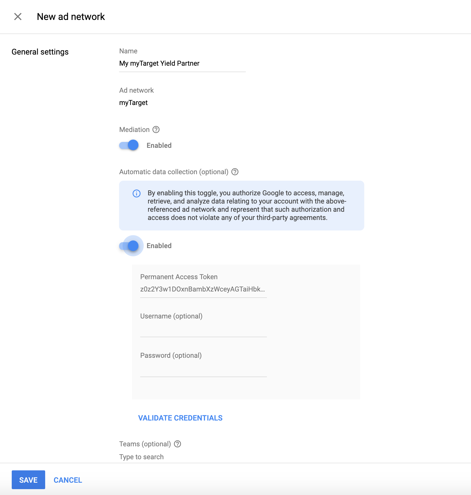 Chọn myTarget làm Mạng quảng cáo, nhập một Tên duy nhất và bật tính năng Dàn xếp.