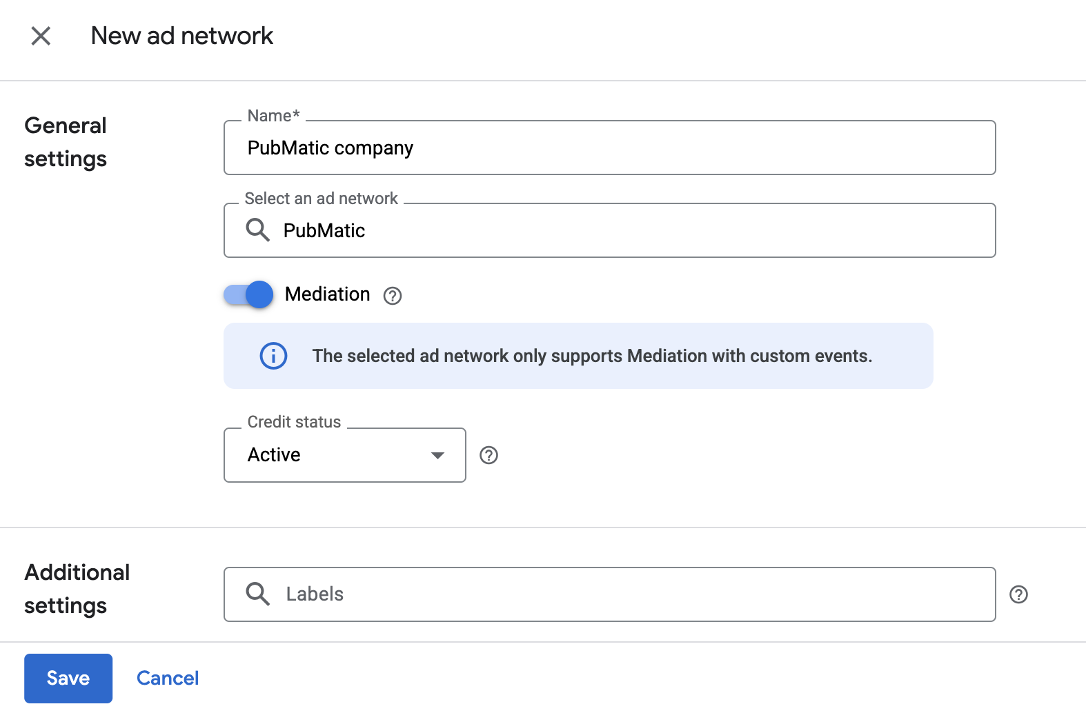 Wählen Sie PubMatic OpenWrap SDK als Werbenetzwerk aus, geben Sie einen eindeutigen Namen ein und aktivieren Sie Vermittlung.