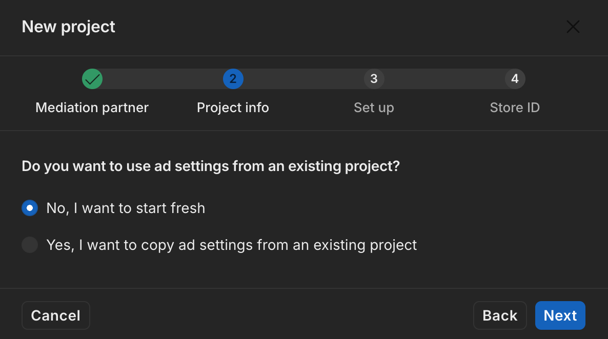 في النافذة المنبثقة مشروع جديد، اختَر سأستخدم التوسّط وGoogle AdMob في شريك التوسّط، ثم انقر على التالي.