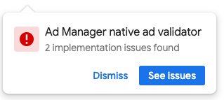 原生廣告驗證工具會自動在 UI 中指出政策違規事項 (顯示於廣告旁的彈出式視窗)。