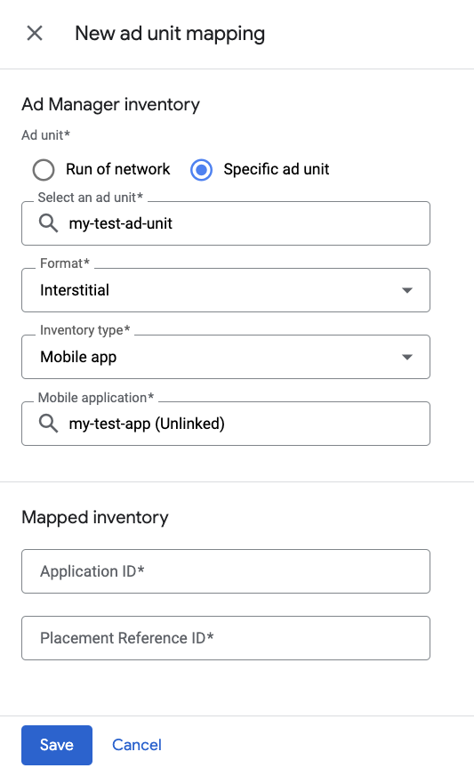 Pilih Unit iklan tertentu. Pilih unit iklan dan format, Aplikasi seluler sebagai Jenis inventaris, dan Aplikasi seluler Anda. Kemudian, masukkan ID Aplikasi dan ID Referensi Penempatan yang diperoleh di bagian sebelumnya.