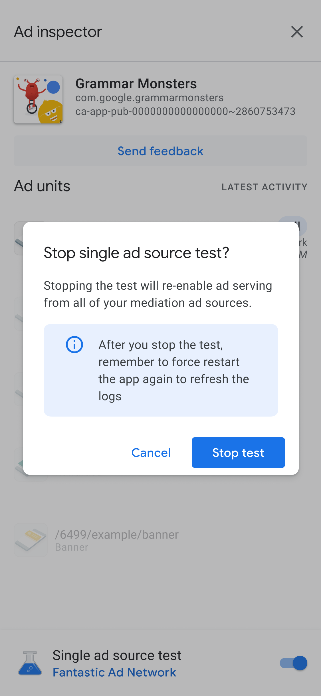 หากต้องการเพิกถอนโฆษณาที่แคชไว้สำหรับแหล่งที่มาของโฆษณาที่ทดสอบ เราขอแนะนำให้คุณบังคับ รีสตาร์ทแอปหลังจากหยุดการทดสอบ