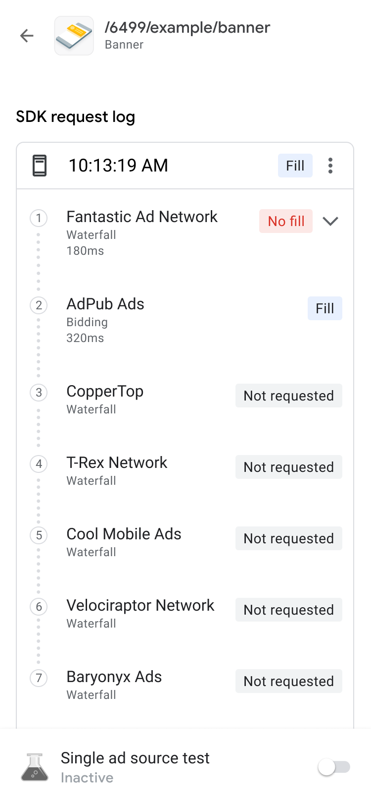 ในแท็บหน่วยโฆษณา ให้แตะหน่วยโฆษณาเพื่อดูบันทึกคำขอ SDK บันทึกคำขอ SDK จะแชร์รายละเอียดเกี่ยวกับ Waterfall จากคำขอโฆษณา เช่น เวลาที่โฆษณาได้รับการส่ง แหล่งที่มาของโฆษณาที่ส่ง หรือหาก Waterfall สิ้นสุดลง โดยไม่มีการส่งโฆษณา