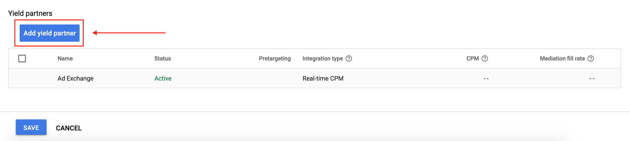 यील्ड पार्टनर चुनने के बाद, इंटिग्रेशन टाइप के तौर पर मोबाइल SDK मीडिएशन, प्लैटफ़ॉर्म के तौर पर iOS, और स्थिति के तौर पर चालू है चुनें. पिछले सेक्शन में मिले ऐप्लिकेशन आईडी, ऐप्लिकेशन सिग्नेचर, और विज्ञापन दिखाने की जगह डालें. इसके बाद, डिफ़ॉल्ट सीपीएम वैल्यू डालें.