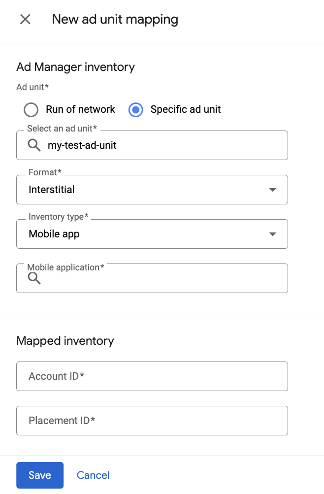Choose Specific ad unit. Select an ad unit and format, Mobile app as the Inventory type, and your Mobile application. Then, enter Account ID and Placement ID obtained in the previous section. Finally, click Save.