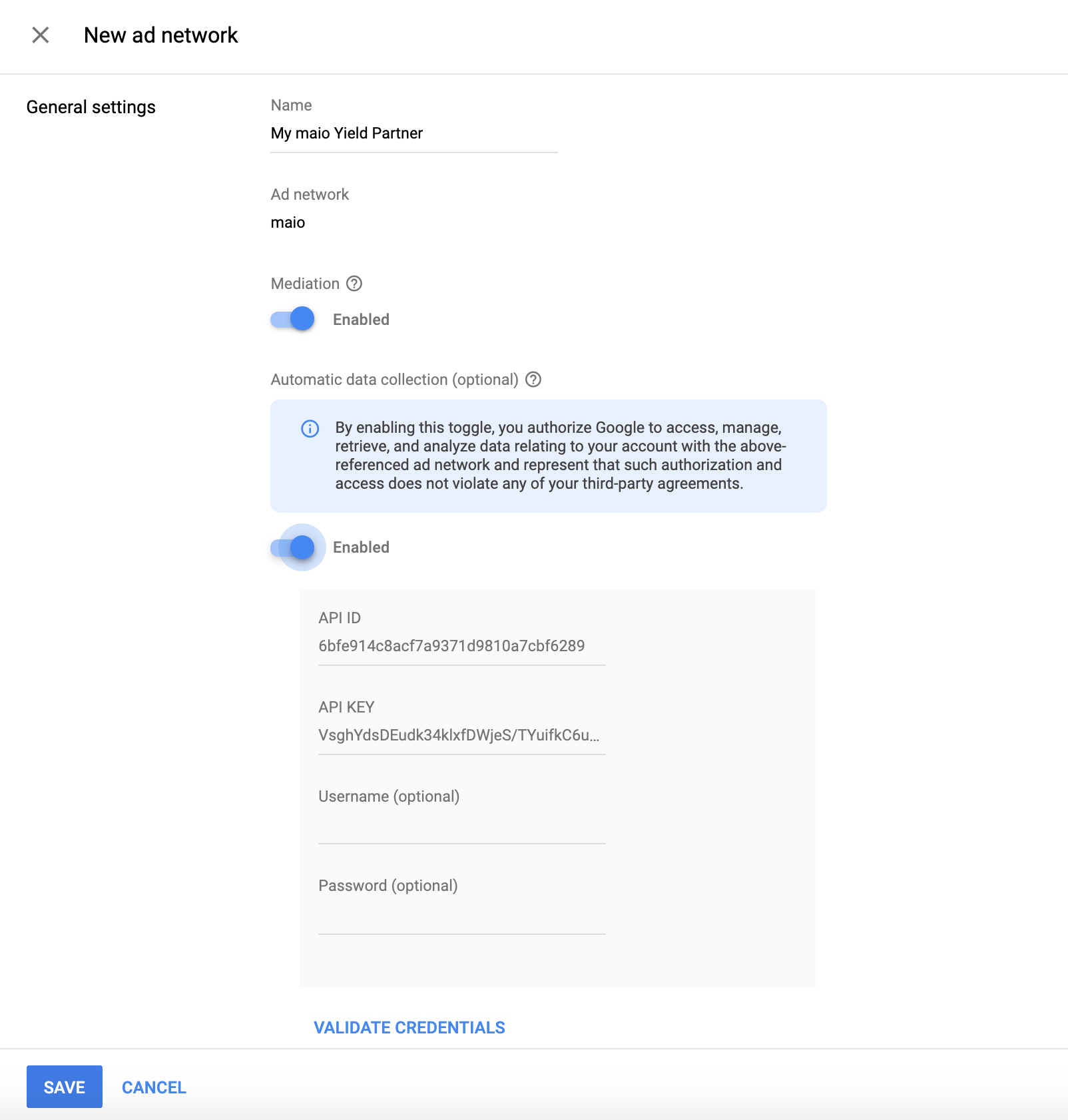 Wybierz maio jako sieć reklamową, wpisz unikalną nazwę i włącz zapośredniczanie.