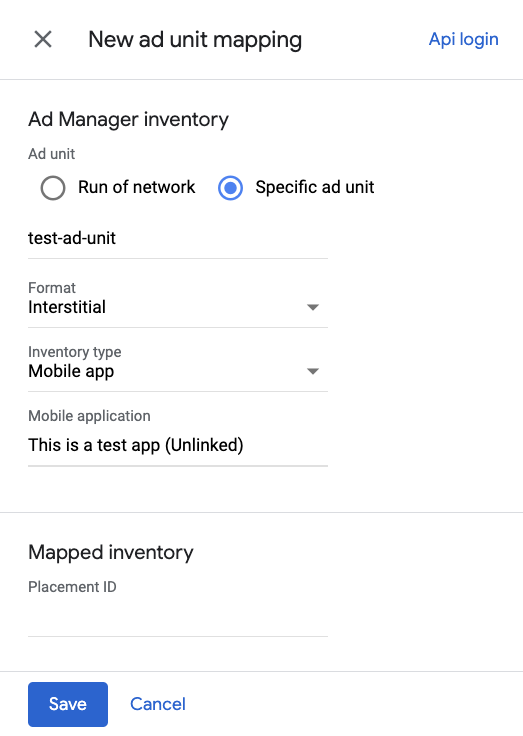 Wählen Sie Spezifischer Anzeigenblock aus. Wählen Sie einen Anzeigenblock und ein Format, Mobile App als Inventartyp und Ihre Mobile App aus. Geben Sie dann die Placement-ID ein, die Sie im vorherigen Abschnitt abgerufen haben.