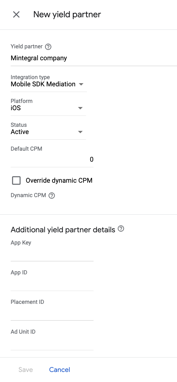 Wpisz uzyskane w poprzedniej sekcji wartości App Key (Klucz aplikacji), App ID (Identyfikator aplikacji), Placement ID (Identyfikator miejsca docelowego) i Ad Unit ID (Identyfikator jednostki reklamowej) oraz wartość Default CPM (Domyślny CPM). Kliknij Zapisz.