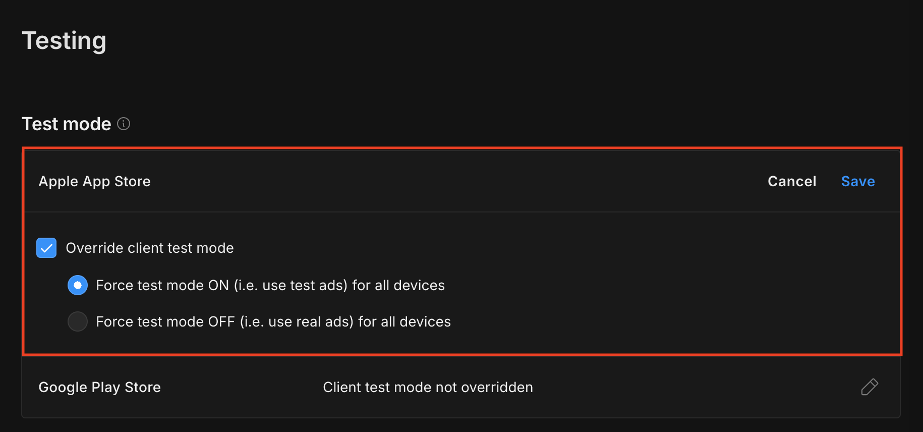 You can force test mode for your app by clicking the edit button beside Apple App Store , enabling Override client test mode and selecting Force test mode ON (i.e. use test ads) for all devices.