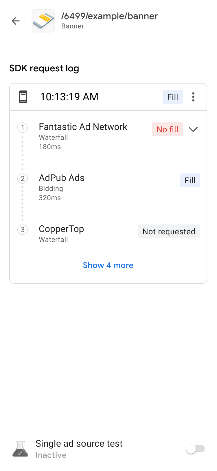 Tippen Sie auf dem Tab Anzeigenblöcke auf einen Anzeigenblock, um sein SDK-Anfrageprotokoll aufzurufen. Das SDK-Anfrageprotokoll enthält Details zur Abfolge ab der Anzeigenanfrage, z. B. wann die Anzeige ausgeliefert wurde, welche Anzeigenquelle die Anzeige ausgeliefert hat oder ob die Abfolge ohne Auslieferung beendet wurde.
