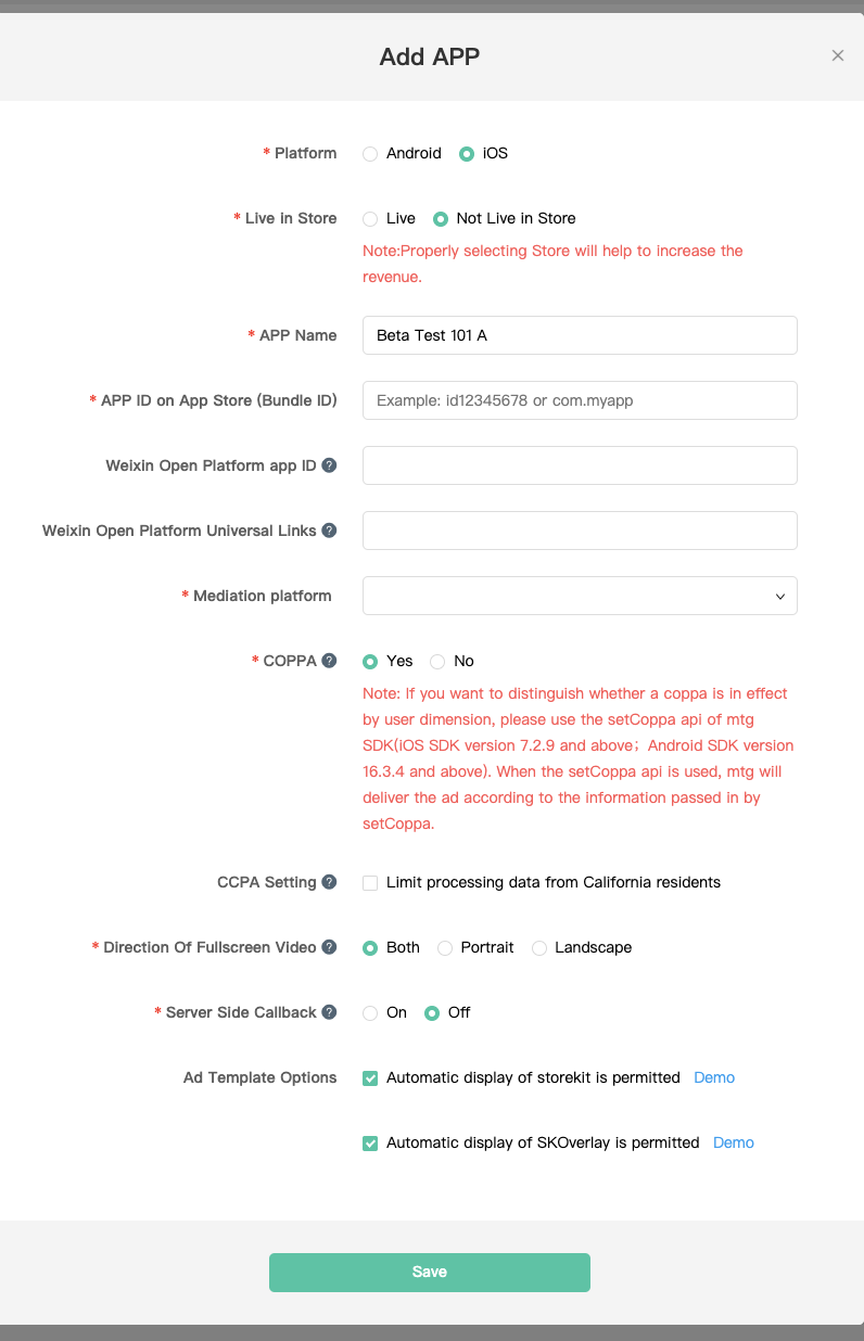 الخطوة 2: إعداد طلب Mintegral في واجهة مستخدم "إدارة الإعلانات"