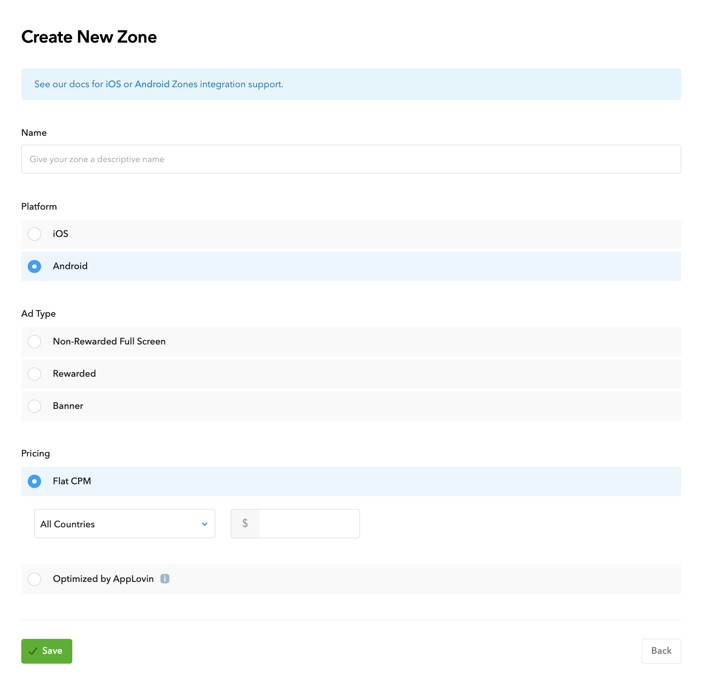 Skonfiguruj ceny w przypadku strefy, wybierając Stały CPM lub Zoptymalizowane przez AppLovin. W przypadku opcji Stały CPM stawki CPM można konfigurować w poszczególnych krajach. Następnie kliknij Zapisz.