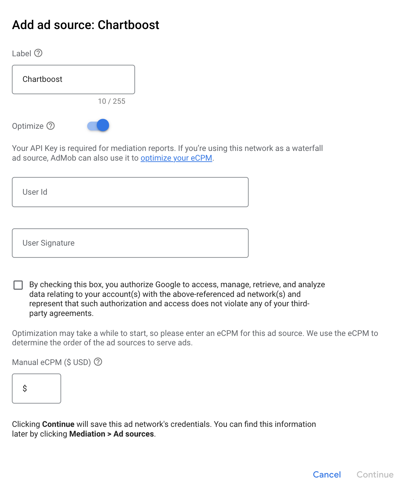 Выберите Chartboost и включите переключатель «Оптимизировать» . Введите идентификатор пользователя и подпись пользователя, полученные в предыдущем разделе, чтобы настроить оптимизацию источника рекламы для Chartboost. Затем введите значение eCPM для Chartboost и нажмите «Продолжить» .