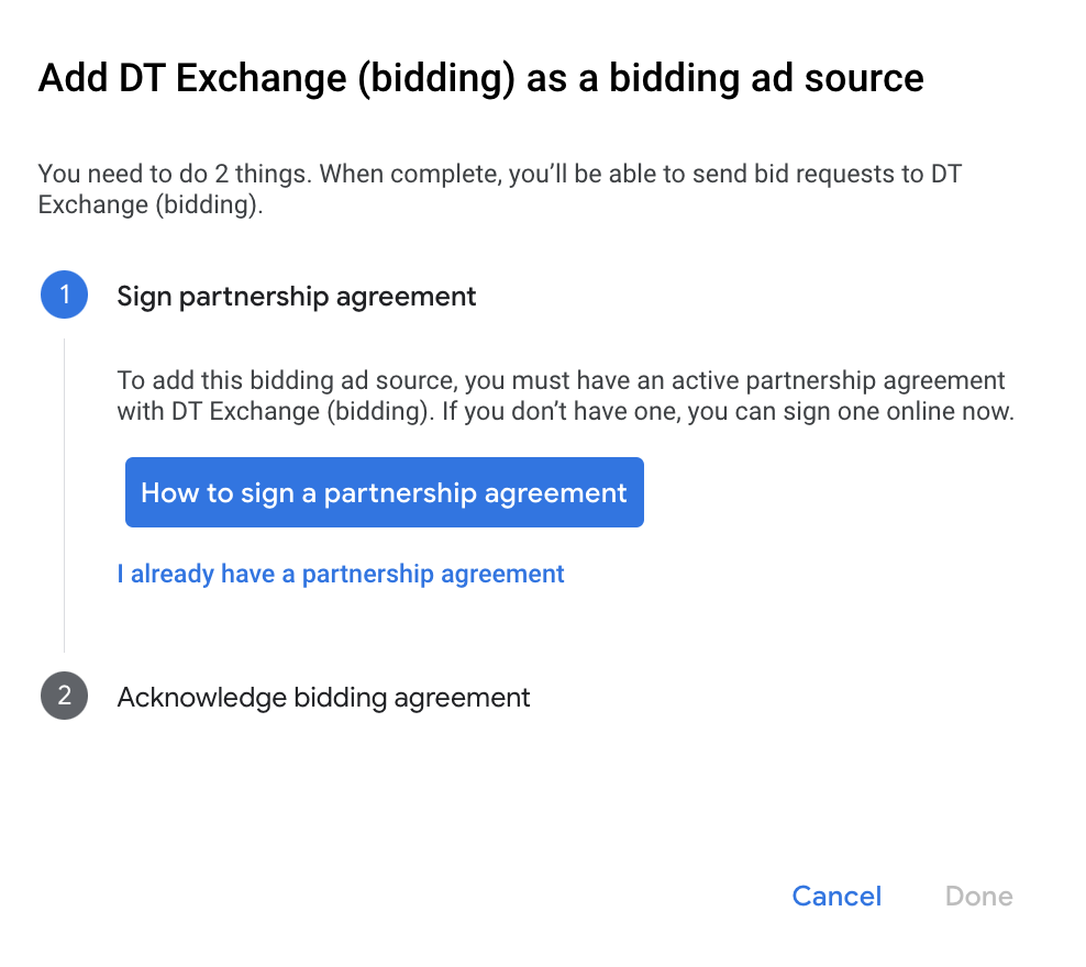 [パートナー契約への署名手順] をクリックし、DT Exchange との入札パートナーシップを設定します。