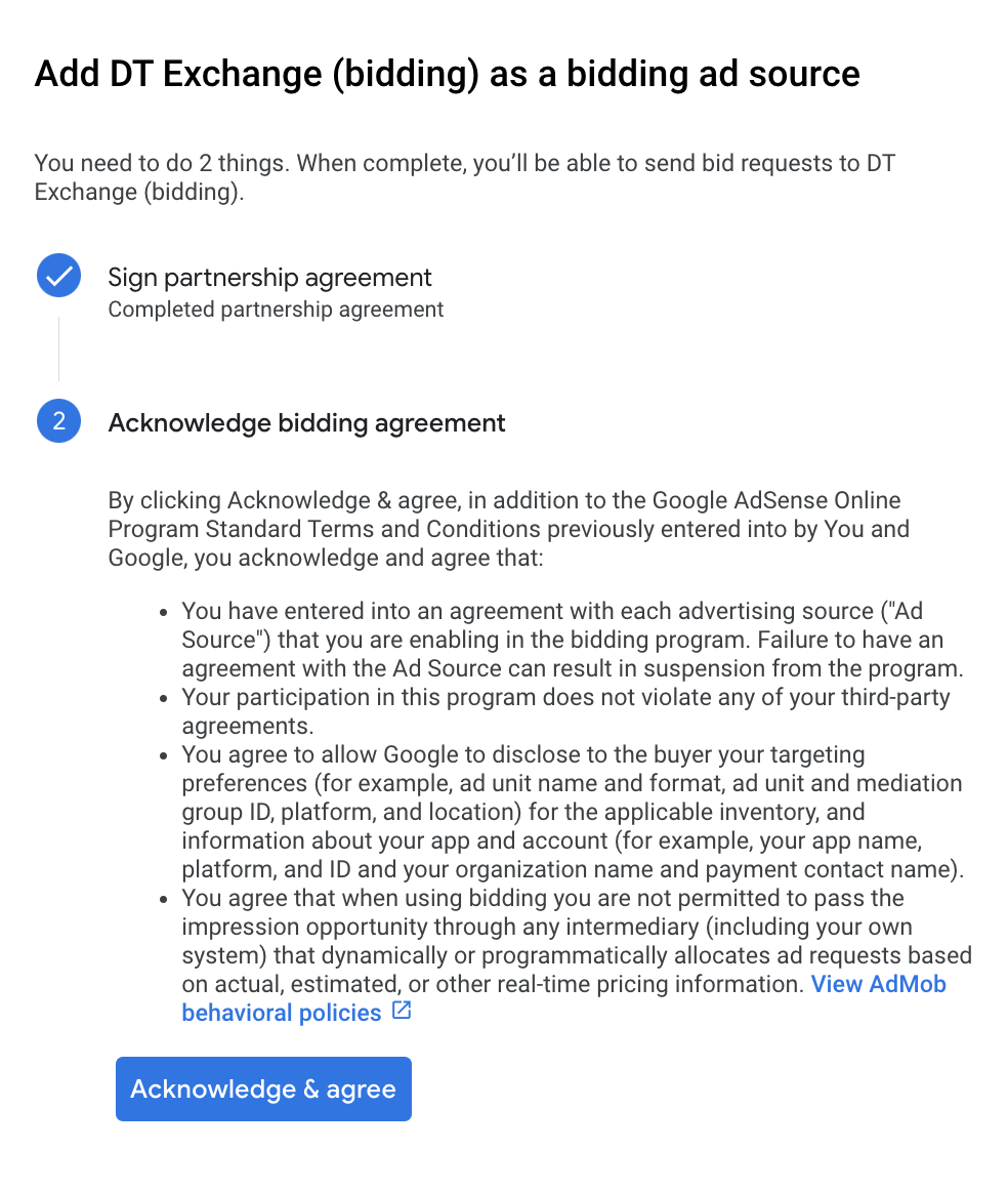 В этом руководстве показано, как использовать Google Mobile Ads SDK для загрузки и отображения рекламы из DT Exchange с помощью AdMob Mediation , включая каскадную интеграцию. В нем описано, как добавить DT Exchange в конфигурацию медиации рекламного блока и как интегрировать DT SDK и адаптер в приложение Android.