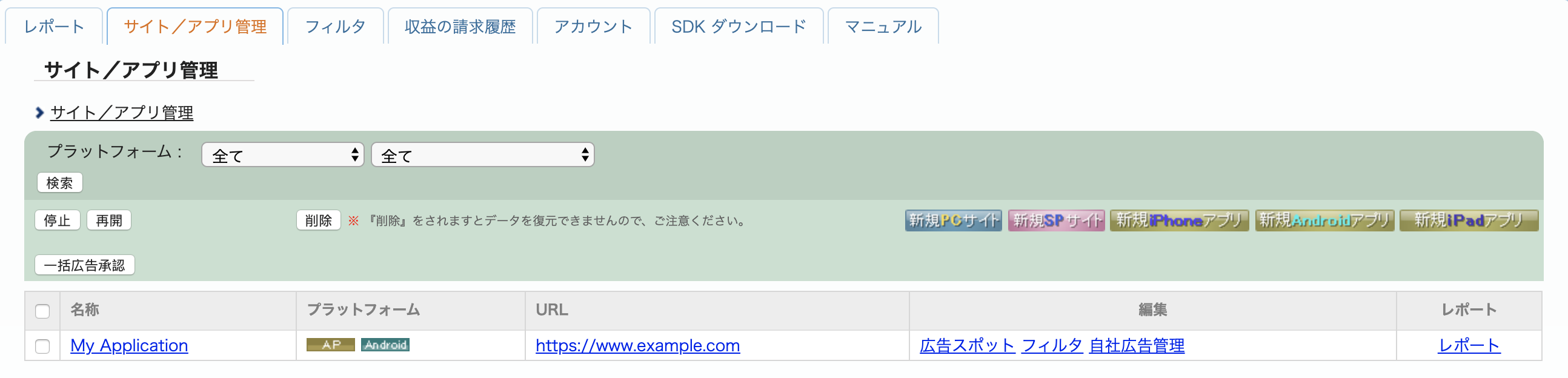 Para criar um novo espaço publicitário, selecione seu app na guia サイト/アプリ管理 (Gerenciamento de site/aplicativo).