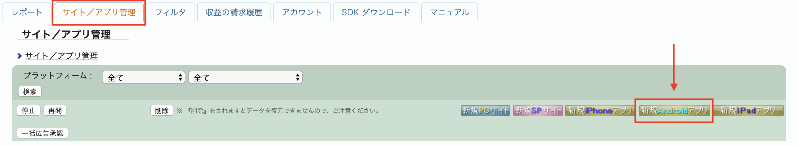 नया विज्ञापन स्पॉट बनाने के लिए, サイト/アプリ管理 (साइट/ऐप्लिकेशन मैनेजमेंट) टैब में जाकर अपना ऐप्लिकेशन चुनें.