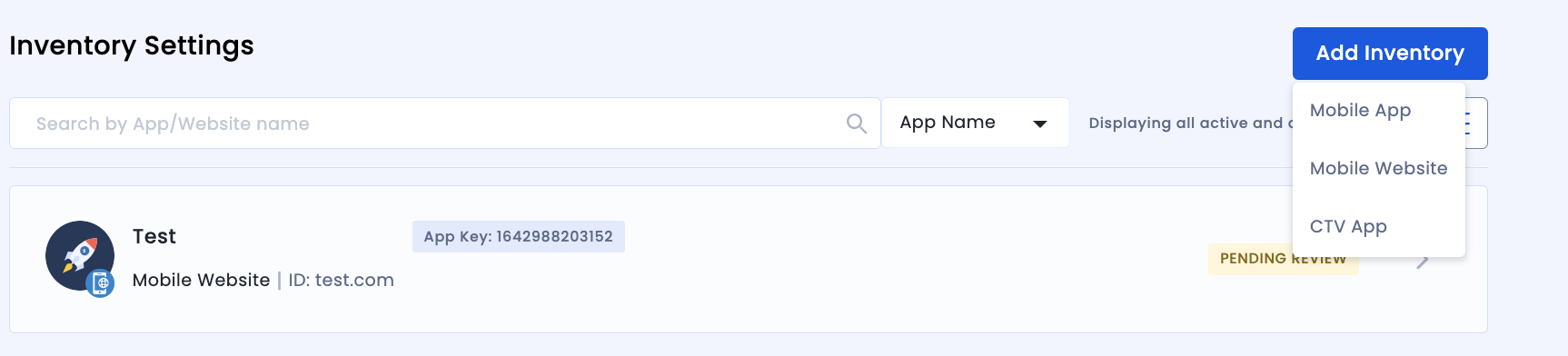 Wenn Sie Ihre App dem InMobi-Dashboard hinzufügen möchten, klicken Sie auf Inventory > Inventory Settings (Inventar > Inventareinstellungen).