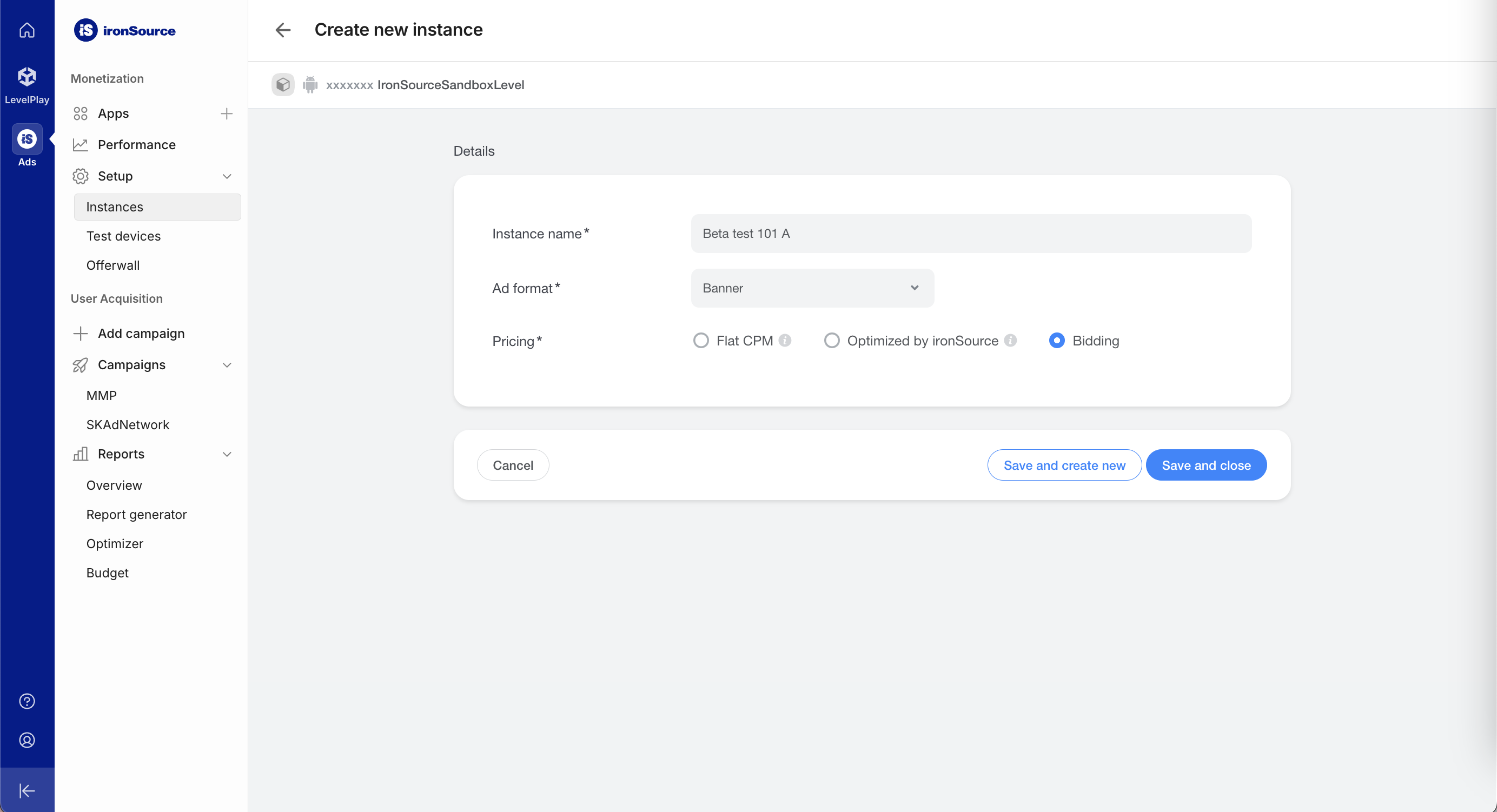 依序前往「廣告」>「設定」>「執行個體」。選取應用程式,然後按一下「建立執行個體」。