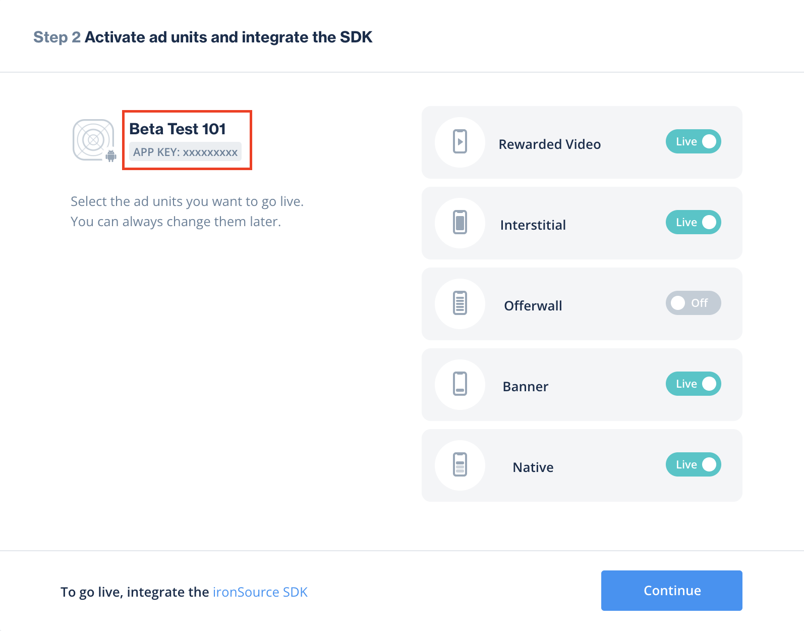 Toma nota de la clave de la app, selecciona los formatos de anuncios que admite tu app y haz clic en Continuar.