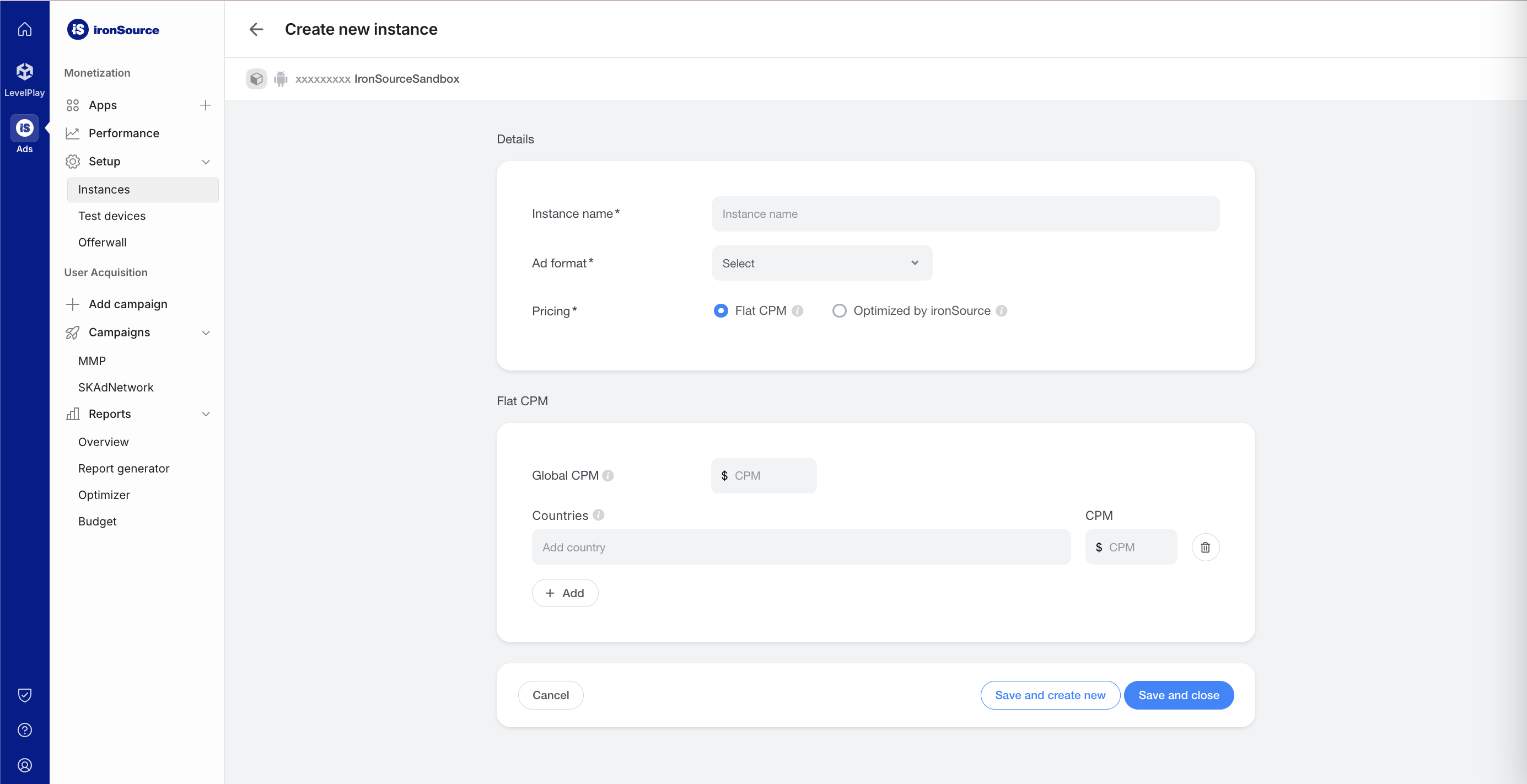 광고 > 설정 > 인스턴스로 이동합니다. 앱을 선택하고 인스턴스 만들기를 클릭합니다.