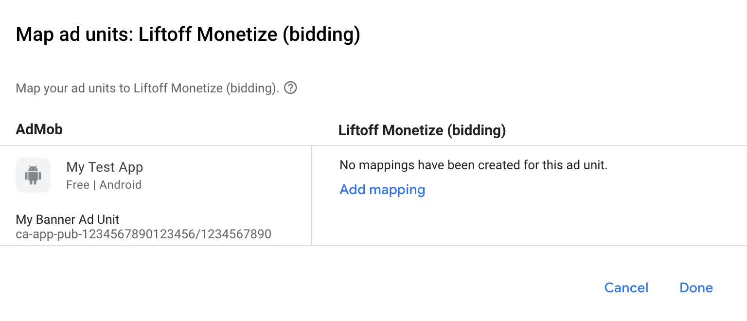 Liftoff Monetize のマッピングがすでに存在する場合は、それを選択できます。それ以外の場合は、[マッピングを追加] をクリックします。