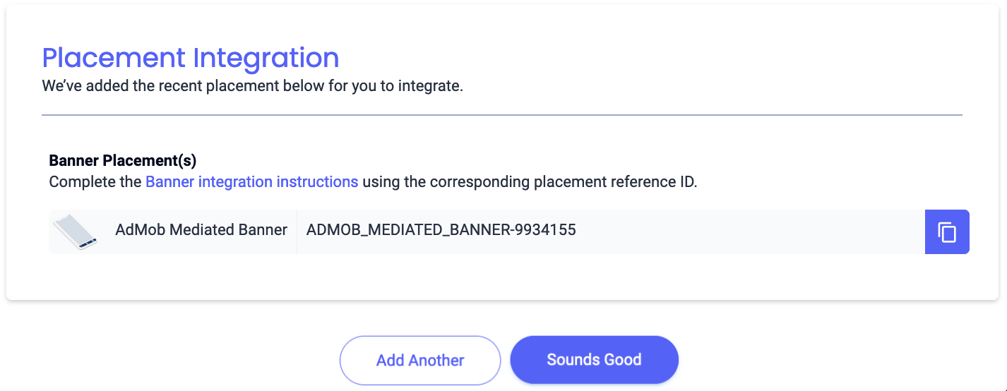 次に、前のセクションで取得したアプリケーション ID とプレースメント参照 ID を入力します。[完了] をクリックします。