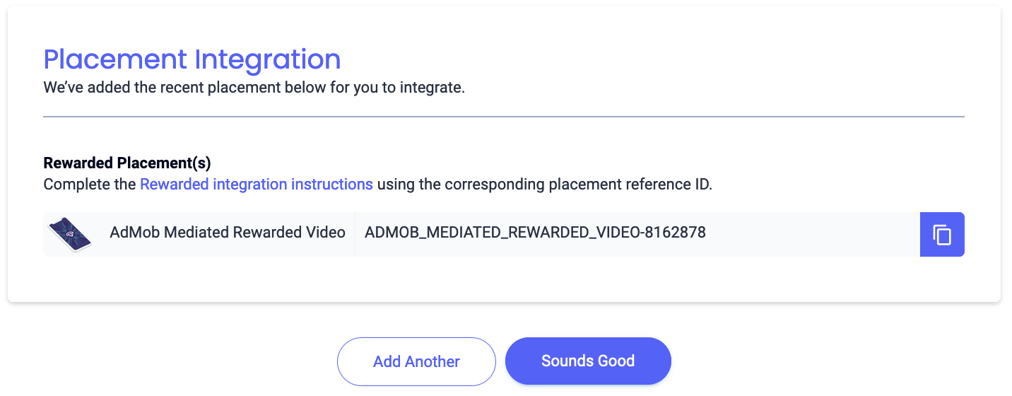 Select Rewarded, enter a Placement Name and fill out the rest of the form. [Bidding only] Under Monetization, toggle the In-App Bidding switch to Enabled. Click the Continue button at the bottom of the page to create the placement.