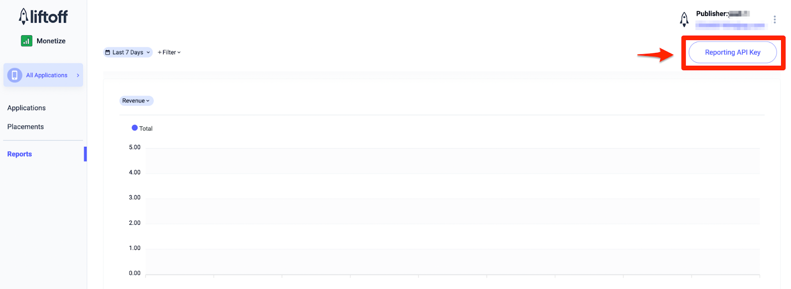 Además del ID de app y el ID de referencia, también necesitarás tu clave de API de Reporting de Liftoff Monetize para configurar tu ID de bloque de anuncios de AdMob. Navega al panel de Liftoff Monetize Reports y haz clic en el botón Clave de API de informes para ver tu Clave de API de informes.