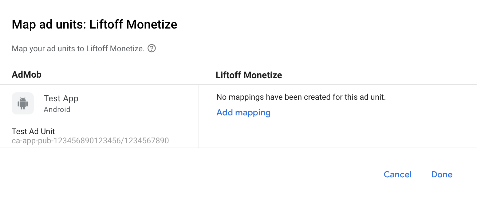 คุณต้องเพิ่ม Liftoff Monetize ลงในการกำหนดค่าสื่อกลางสำหรับหน่วยโฆษณา