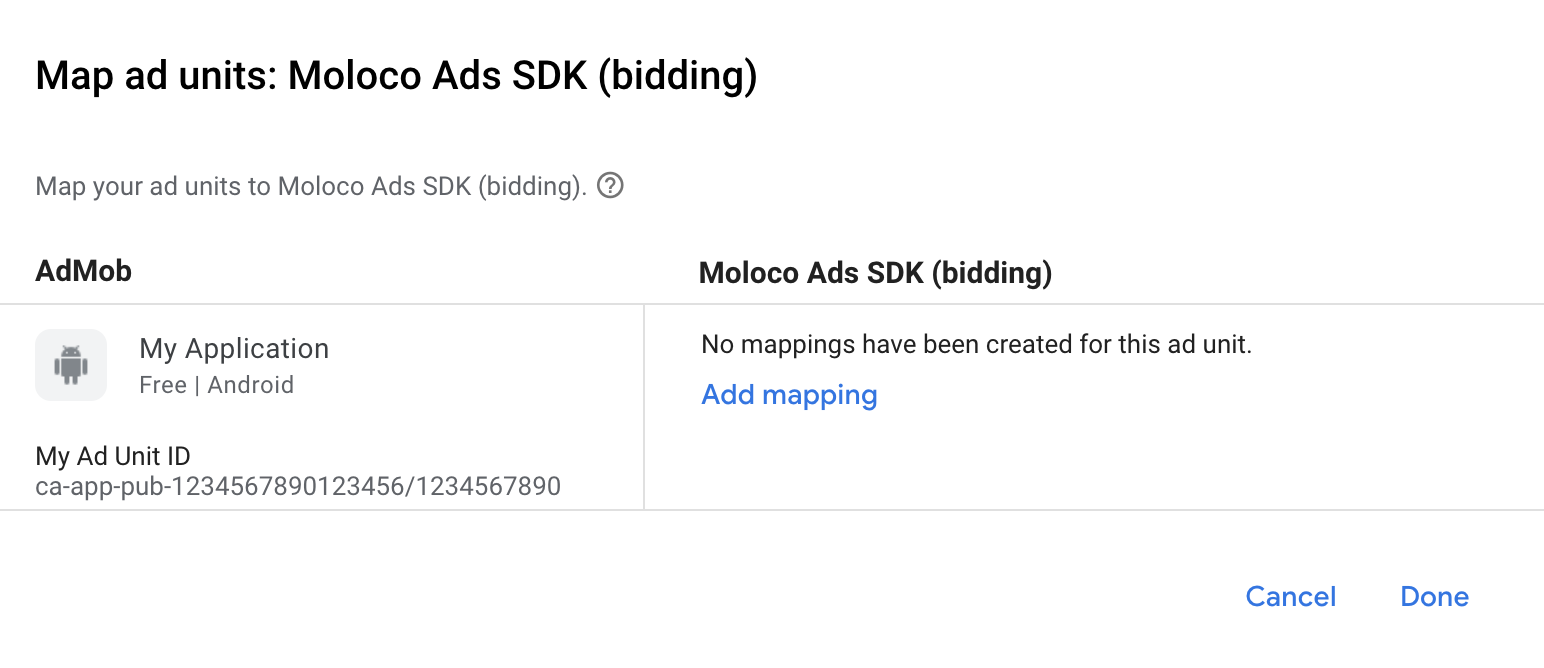 如果您已为 Moloco Ads SDK 创建映射,可以选择该映射。否则,请点击添加映射